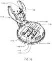 In various embodiments locking the fillingaid9100 from movement with respect to the fillingaid base9142 when the fillingneedle cradle portion9106 is in the filling position may be desirable for many reasons, including, but not limited to, once the fillingneedle9134 pierces the septum, movement or rotation of the fillingaid9100 with respect to thefiling aid base9142 may cause damage to the septum and/or the reservoir and/or cause leakage.