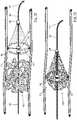 FIGS.119aand119bshows anotherbasket frame911 according to the invention. The basket frame has atether connection912 at the distal end. The frame may be constructed from a cut sheet of material. The frame may be constructed from cut tubular material. The frame may be constructed of wire material. The frame may be constructed of ribbon material. The material may be Nitinol. In the frame ofFIGS.119aand119bthepull tether21 in integrally attached to the frame. It will be appreciated that the pull tether may be attached by other means such as welding, laser welding, bonding, or tied to the basket frame. The frame inFIG.119 haseyelets6 as net attachment points.