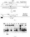 Example 5Knock-in ES cell clones were formed to test HDR-mediated gene repair of mouse ES cells. Knock-in ES cell clones were formed by electroporating ES cells (1×107cells in 0.9 mL PBS) with sgRNA vector and donor vector, discussed in Examples 1 and 2. The cells were electroporated with 15 mg of linearized donor vector and 7.5 mg of single guide RNA sgRNA vector, using the BioRad Gene Pulser II (Bio-Rad Laboratories, Hercules, Calif.) with the following settings: 250 mV, 500 mF capacitance. The ES cells were cultured with 500 mg/mL G418 for ˜20 days. The G418-resistant colonies were picked and cultured in a 96-well plate until most wells were ˜80% confluent with cells. The cells were then trypsinized and split into two 96-well plates. One plate of ES cells was frozen at −80° C., and another plate was used to prepare genomic DNA for PCR screening and confirmation by Southern blotting.