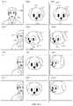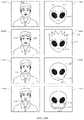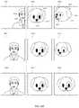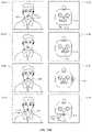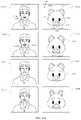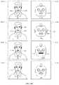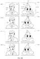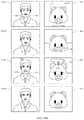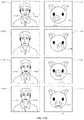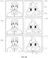 In states2601F and2601G, the user'shead2604 has shifted down in the field of view of the camera and back to the center of the field of view, while the user'smouth2606 maintains the frowning facial expression. In states2602F and2602G, the reference avatar in the middle column shifts down to match the position of the user while maintaining the frowning expression. Instate2603F, the device now detects the user, and begins to modify the displayed virtual avatar based on the detected appearance of the user instate2601F. The modification to the dog avatar is shown instates2603F and2603G, withstate2603F being a transitory state between the displayed appearance of the avatar instate2603E and the final displayed appearance of the avatar instate2603G. Specifically, the device modifies the dog avatar'smouth2616 so that it transitions from the large smile instate2603E to a frown shown in2603G, with an intermediate position shown instate2603F. Additionally, the device modifies the orientation and position of the dog avatar'shead2614 to match that of the user. For example, the device moves the position of the dog avatar'shead2614 from the top left corner of the bordered region instate2603E, to the lower position shown instate2603G, with an intermediate position shown instate2603F. Similarly, the device rotates the avatar'shead2614 from the sideways orientation instate2603E to the front-facing orientation shown instate2603G, with an intermediate position shown instate2603F.