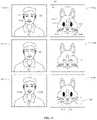 Instate2601B, the user is moved higher within the field of view of the camera, and is beginning to turn his head to his left (e.g., the user'shead2604 is positioned higher than instate2601A and is slightly rotated to the right from the camera's perspective), while moving slightly beyond the field of view of the camera. At the same time, the user is starting to smile (e.g., the user'smouth2606 is moving to a smiling position and, instate2601B, the user's mouth is shown slightly raised (as the user is beginning to smile)). Instate2602B, the reference avatar'shead2614′ is moved higher within the bordered region than instate2602A (e.g., to match the vertical position of the user'shead2604 instate2601B), and is slightly rotated to the left (from the user's perspective) while shifting to the edge ofborder2605 to represent the movement of the user's head instate2601B. As the reference avatar rotates itshead2614′, theears2618′ sway slightly with the rotation of the head in accordance with a physics model associated with theears2618′. The reference avatar'smouth2616′ is turned up to a slight smile, matching the movement and position of the user'smouth2606 instate2601B. Instate2603B, the device detects the user'shead2604 andmouth2606 in the field of view of the camera and having the positions shown instate2601B. Accordingly,state2603B shows the device displaying the dog avatar having the same position as the reference avatar instate2602B.
