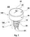 Various aspects of the first and second embodiments can be combined with each other or used in place of each other. For example, as shown inFIG.9, thehead portion124 of the bone penetrating member has thestep28 but not thegroove56 shown inFIG.3, and thecap140 in the second embodiment has thelower rim50 but not theprojection54 of the first embodiment shown inFIG.3. That is, bottom of thehead portion124 corresponds in shape to the bottom of thehead portion24 shown inFIG.6. However, thehead portion124 of the second embodiment may include thegroove56 of the first embodiment shown inFIG.3, and thecap140 of the second embodiment may include theprojection54 shown inFIG.3. Thegroove56 andprojection54 can engage with each other to further secure thecap140 to thebone penetrating member120 in the same manner as in the first embodiment. In addition, theprojection64 of thecap140 of the second embodiment can be used with thecap14 of the first embodiment.