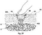 Installation (and eventual removal) of the bonemarrow access apparatus400 is performed in substantially the same manner as described above with respect to the first embodiment or the second embodiment (depending on whether thecap440 includes theseptum52 as in the first embodiment or thevalve60 as in the second embodiment). The installation differs in that after the assembly of thebone penetrating member420 and thecap440 is installed in the bone8 (seeFIG.38), tissue is dissected to fit thering88 right under the subcutaneous layer. The height of thering88 can be adjusted by tying thering88 to thecap440 at a desired length (seeFIG.38). Thering88 may be below theskin82 and above the tissue (seeFIG.39). After the skin is closed up, an irregularity in the skin will be visible and/or palpable, which irregularity may be either a raised ring of skin or unnatural depression (seeFIG.40).