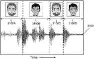 Multiple possibilities are enabled byapparatus110 combining a sound capture device and an image capture device such as, for example, cataloging or diarization of audio captured by the device. As schematically illustrated inFIG.31A, diarization is the process of partitioning an input audio stream into segments according to the speaker's identity. For example, speaker diarization may involve partitioning an inputaudio signal stream3100 intomultiple audio segments3100A,3100B,3100C,3100D according to the speaker's identity. Diarization may enhance the readability of automatic speech transcription by structuring theaudio stream3100 intoaudio segments3100A,3100B,3100C,3100D associated with different speakers. Diarization, when used together with speaker recognition systems, may enable identification of the speakers even when the speaker is not visible. Such processes may assist in identifying not only the speaker, but also the words spoken by a particular speaker. Speaker diarization may also involve identifying points in an audio stream when a speaker changes. After an audio stream is partitioned into different segments based on different speakers, speech associated with each speaker may be clustered or grouped and catalogued together in a database.