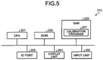 TheCPU201 executes thecalibration program207 loaded into theRAM203. Specifically, in thecontrol unit270, according to an instruction input by the user from theinput unit205, theCPU201 reads thecalibration program207 from theROM202, deploys thecalibration program207 in a program storage area in theRAM203, and performs various calibration processes. TheCPU201 temporarily stores various data generated in the various calibration processes, in a data storage area formed in theRAM203. When each of the calibration processes is completed, the calibration parameters are updated.