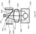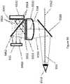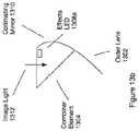 The effects of thelight trap16930 on image contrast can be seen in the two rows at the bottom of Table 1 that relate to image contrast as shown by ratios of the “Image light to the eye”, which represents the displayed image brightness, divided by the “light back to the image source” where the light back to the image source comes from either the image light being reflected back to the image source or from scene light being reflected back to the image source. In both sets of numbers, the ratio is dramatically higher (1000× or more) in Cases 2-5 where there is alight trap16930 compared toCase 1 where there is not a light trap. The light loss produced by having a light trap can also be seen in the numbers for the “Image light to the eye” whereinCase 1 shows approximately 2× higher numbers indicating a brighter displayed image.