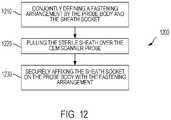 The method begins atstep1210, at which the probe body and the sheath socket conjointly define a fastening arrangement. Atstep1220, thesterile sheath200 is pulled over theCEM scanner probe100. Themethod1200 concludes withstep1230, at which the sheath socket is securely affixed on the probe body with the fastening arrangement.