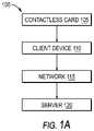 FIG.1A illustrates a data transmission system according to an example embodiment. As further discussed below,system100 may includecontactless card105,client device110,network115, andserver120. AlthoughFIG.1A illustrates single instances of the components,system100 may include any number of components.