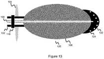 FIG.13 shows a distal portion of anocclusive device120, generally similar to the embodiments of the occlusive device shown and described earlier utilizing abarrier104, outertubular member102 which conveys inflation fluid to aballoon106, and an innertubular member108 used to deliver adhesive. Theocclusive device120 further includes adistal membrane122 distal of theballoon106. Themembrane122 includes a plurality of pores or holes124 which provide an exit path for adhesive which is delivered through the membrane. In thisway membrane120 can be considered permeable or semi-permeable.