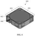 FIG.4 illustrates a plan view of afan400, according to some embodiments. As used herein, thefan400 shown can be the same fan used inFIG.1E. When active, thefan400 can direct air away from the heatsink. In some embodiments, thefan400 includes a plurality ofopenings402. In some embodiments, theopenings402 can be configured to receive a screw for mounting the fan to the spacer described inFIGS.1E and5A-5D. In some embodiments, thewidth404 of thefan400 can be in a range of approximately 35-45 mm. In an example, thewidth404 of thefan400 can be approximately 40 mm. In some embodiments, thelength406 of thefan400 can be in a range of approximately 35-45 mm. In an example,length406 of thefan400 can be approximately 40 mm. Thefan400 can includewires408 for electrical power.