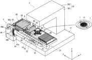 Theholding unit22 includes, as depicted inFIG.2, a rectangularX-direction moving plate30 mounted on thebed21 movably in the X direction indicated by the arrow X, a rectangular Y-direction moving plate31 mounted on theX-direction moving plate30 movably in a Y direction indicated by an arrow Y and intersecting the X direction at right angles, acylindrical post32 fixed on an upper surface of the Y-direction moving plate31, and arectangular cover plate33 fixed on an upper end of thepost32. On thecover plate33, the chuck table34 is disposed extending upward through an elongated hole formed in thecover plate33. The chuck table34 is configured to hold thewafer10 and to be rotatable by undepicted rotary drive means. Configuring the upper surface of the chuck table34, thesuction chuck35 is disposed. Thesuction chuck35 has a circular shape, is formed from a porous material having air permeability, and extends substantially horizontally. Thesuction chuck35 is connected to undepicted suction means via a flow passage that extends through thepost32, and fourclamps36 are arranged at intervals around thesuction chuck35. Theclamps36 grip the frame F with thewafer10 held thereon when fixing thewafer10 on the chuck table34. A plane defined by the X direction and the Y direction forms a substantially horizontal plane.