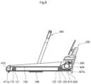The back surface of thefront support423 may have teeth that interact with teeth of thegear423a, which may turn manually or via a motor. When thegear423aturns in a first direction, thefront support423 may be slid downward with respect to thestand424, and the upper andlower frames140 and150 may rise. When thegear423aturns in a second direction, thefront support423 may be slid upward with respect to thestand424 and inserted into thetreadmill1 to lower the upper andlower frames140 and150.