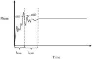 FIG.6 is a time-domain plot of a transmitted signal's phase comprising a transient signal portion that may be adapted in accordance with aspects of the invention.