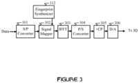The S/P converter301 converts an input digital data sequence into a parallel data format. Typically, the input data sequence comprises information bits and error-correction bits (such as parity check bits). The signal mapper302 (typically a modulator) maps data symbols to a constellation of modulation values. For example, phase-shift key (PSK) values or quadrature amplitude modulation (QAM) values are commonly used. Thesignal mapper302 may optionally employ a spreading matrix for spreading the input symbols prior to mapping to the constellation. Since thesignal mapper302 conveys data symbols to frequency bins of theIFFT303, in some aspects of the invention, thesignal mapper302 comprises a filter for shaping the spectrum of the IFFT's303 output.