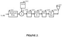 TheVCO212 andmixer202 constitute a frequency up-converter. Since both theVCO212 and themixer202 can impart identifying characteristics to the transmit signal, one or both of these components may be configurable for imparting selectable identifying characteristics to the transmitted signal. For example, mixers (such as the mixer202) typically rely on the non-linear relationship between voltage and current to multiply a pair of input signals. Mixers typically comprise diodes, transistors biased near cut off, analog multipliers, and/or non-linear optics. Thus, variations within the manufacturing tolerances of these components can produce distinguishing features in the non-linear behavior, enabling the transmitted signal to be analyzed for identifying the transmitter.