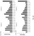FIG.35 is a graph of distribution of users by average downlink Physical Resource Block (PRB) allocation. Real-time monitoring shows downlink resources allocated to each user. Allocations occur many times per second. A significant concentration of users on 739 MHz are allocated resources for voice service. Most users on 2165 MHz are allocated resources common for high-speed data.