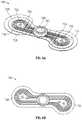 For example,FIG.7B illustrates aflexible body110 having a profile generally resembling an accentuated bowtie, Papillon ears, and/or a round dumbbell. Theflexible body110 may comprise a longitudinal axis extending from the outer edge of one of thewings130,131 to the outer edge of the other and symmetrically bisecting the twowings130,131. Theflexible body110 may have a transverse axis perpendicular to the longitudinal axis and symmetrically dividing the flexible body110 (e.g., the bottom substrate layer330), separating the twowings130,131. Thehinge portion132 of the flexible body of thedevice100 may extend between thehinge lines134 of the twowings130,131. Thehinge portion132 may symmetrically bisect theadhesive layer340 in the longitudinal direction. Thehinge portion132 may be narrower in the transverse direction than the twowings130,131. Thehinge portion132 may be narrower in the transverse direction than the underlying substrate layers (e.g., butterfly flap layer203). The outer edge of theflexible body110 may extend inward toward the longitudinal axis and the transverse axis from the hinge lines134. The outer edges may have a curved shape where the outer edges intersect the hinge lines134. In some embodiments, the outer edges may each comprise an inflection point at which the outer edges transition from a convex curvature to a concave curvature. The concave curvature may be positioned closer to the transverse axis than convex curvature. The inflection point may be positioned on thehinge line134, outside the hinge line134 (opposite the transverse axis), or inside the hinge line134 (same side as the transverse axis). The curved edge of theadhesive layer340 where theadhesive layer340 intersects the hinge line135 may adjust the vector of pull away from the edge by changing the angle of the edge as it extends across thehinge line134, a point where theadhesive layer340 may be particularly prone to peel.