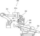 Referring toFIG.1, for example, an operating table203 is disposed in an operating room, and apatient204 is laid on the operating table203. Thepositioner201 is disposed near the operating table203. Thepositioner201 is placed on an appropriate table (not shown). Thepositioner201 is configured by, for example, an articulated robot. A base201ais provided at a distal end of thepositioner201. Asurgical manipulator202 configured by an articulated robot is attached to the base201a. Thesurgical manipulator202 has, for example, a base part, anarm401, and an end effector that is detachably attached to thearm401. The base part is fixed to the base201a, and the base part and alink404, andlinks404 are connected by a plurality of joints. A plurality of (here, for example, four)arms401 is connected to the base part. Asurgical tool402 is attached to a distal end of each of the plurality ofarms401 as an end effector. Thesurgical tool402 includes, for example, forceps and an endoscope.