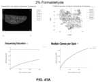 FIG.40 shows exemplary antibody staining wherein tissue sections of mouse spleen are fixed in either 2% formaldehyde or methanol. In both the 2% formaldehyde and methanol fixation conditions, CD3 can be seen in the pockets of white pulp, and CD29 in the red pulp portion of the spleen.