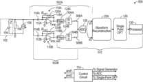 In the example shown inFIG.2, the back-end circuit222 can include components of both thefirst channel202A and thesecond channel202B, namelyanti-aliasing filters124A,124B andADCs126A,126B, as well as components shared by both thefirst channel202A and thesecond channel202B, namely awaveform reconstruction circuit204, a single-point DFT filter128, and aprocessor130.