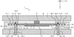 One end of thediaphragm12 is formed with a plurality of through holes through which a fixingscrew15A for fixing theactuator10 to thebase member5 can pass. In the same manner, the other end of thediaphragm12 is formed with a plurality of through holes through which a fixingscrew15B for fixing theactuator10 to thebase member5 can pass. In theactuator10 of this disclosure, for example, at the center in the Z direction, one end of thediaphragm12 is formed with three through holes12-11,12-12 and12-13 disposed from the outside to the inside in the Y direction. In the same manner, for example, at the center in the Z direction, the other end of thediaphragm12 is formed with three through holes12-21,12-22 and12-23 disposed from the outside to the inside in the Y direction. The through holes12-11,12-12 and12-13 and the through holes12-21,12-22 and12-23 are formed symmetrical with respect to thepiezoelectric element11, at the center in the Z direction, for example.