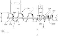 In an embodiment, referring again toFIGS.19 and19A, within thebackground pattern334 and the macro pattern336 a frequency and/or an amplitude range of rugosities in thefirst substrate302 and thesecond substrate304 may be different. For example, larger frequency or amplitude rugosities, or ranges thereof, may be provided on the substrate on the garment-facing surface to connote stretch and smaller frequency or amplitude rugosities, or ranges thereof, may be provided on the substrate on the wearer-facing surface to create a smoother surface on the skin of a wearer to prevent, or at least inhibit, skin markings associated with the rugosities. The “rugosities” are formed by the pleats or folds in the first andsecond substrates302 and304 when theelastic elements306 are contracted into a relaxed, or partially relaxed, state. The first andsecond substrates302 and304 may be bonded to or adhesively attached (e.g., using glue) to theelastic elements306 atbond sites309. In some embodiments, the first and second substrates, or portions thereof, may also be bonded directly to each other. Theelastic elements306 inFIGS.19 and19A are shown in their relaxed or contracted state. If theelastic elements306 where partially elongated in the directions of arrow A, the rugosities in the first andsecond substrates302 and304 would begin to flatten (i.e., reduce in amplitude). If theelastic elements306 where fully elongated, or mostly elongated, in the directions of arrow A, the first andsecond substrates302 and304 may be generally flat or substantially flat. As such, to form the rugosities in the first andsecond substrates302 and304, theelastic elements306 are attached to one or both of the first andsecond substrates302 and304 in their expanded or prestrained state and then allowed to contract into a state of lower energy.