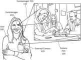 Example images are shown inFIGS.1B and1C.FIG.1B shows animage140 captured by the external camera, andFIG.1C shows animage150 captured by thefemtoimager110. If thefemtoimager110 and theexternal camera120 are facing a same direction, the captured images have overlapping views of the external environment. In the example of FIGS.1B and1C, theexternal camera120 captured animage140 of three people sitting at a table, and thefemtoimager110 captured aheadshot image150 of the man on the left. Due to its size and other constraints, thefemtoimager110 may capture images with a lower resolution and at a slower frame rate compared to the external camera. Differences in resolution may be seen, for example, by comparingFIG.1B withFIG.1C. In some embodiments, the femtoimager has a resolution of 256×256 pixels over 15 degrees of FOV and the external camera has a resolution of 2500×2500 pixels over 50 degrees FOV. In another example, the external camera has a FOV at least two times higher than a FOV of the femtoimager and/or the external camera has a total number of pixels that is least ten times higher than a total number of pixels of the first image captured by the femtoimager. The two imagers may operate in overlapping wavelength bands.