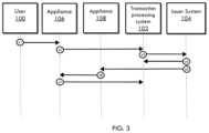 Referring now toFIG.3, a sequence diagram is shown according to non-limiting embodiments. At a first step s1, theuser100 requests to conduct a transaction with afirst appliance106. The user may do so by audibly speaking the request, communicating the request through a computing device in communication with theappliance106, and/or the like. At step s2, thefirst appliance106 communicates the transaction request, or a separate transaction request based on the transaction request, to thetransaction processing system102. At step s3, thetransaction processing system102 requests a LUK from theissuer system104 corresponding to the user's account. At step s4, theissuer system104 communicates an LUK to the transaction processing system. At step s5, theissuer system104 also communicates the LUK to thesecond appliance108. It will be appreciated that the LUK may be provided to thesecond appliance108 in various ways from thetransaction processing system102,issuer system104, and/or payment gateway.