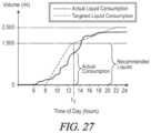 The monitoring application ofelectronic device70 may also display liquid information data, liquid monitoring data, and nutritional monitoring data to the user. In one embodiment, liquid information data that is displayed to a user by the monitoring application ofelectronic device70 may include the volume of liquid consumed within a time period, the volume of liquid within the container, the rate at which a liquid is being consumed, a comparison of the volume or rate of liquid that is consumed with a target hydration profile during the day or threshold, warnings related to excessive temperatures, warnings related to potential spoilage, any other suitable information, or any combination thereof. An exemplary display of liquid information data is shown byFIG.27, which illustrates a graph of actual liquid consumption relative to a target hydration profile for a given day. Such profile indicates how much total liquid consumption is desired at various times in the day. In some embodiments, the profile may be defined in terms of rate of consumption (which may vary throughout the day, e.g., increase when ambient air temperature is or predicted to be greater) or other parameters instead of total amount of consumption. Actual consumption is compared to the targeted consumption indicated by the user's target hydration profile and feedback is provided indicating whether the user's consumption is consistent with (e.g., within a certain range) of target hydration profile.