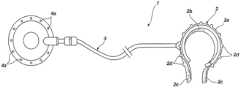 According to the present improvements and as showed inFIGS.4 and5, the banding ring (2) is configured by a hydraulic sleeve in the shape of “C,” forming a support for an inflating balloon, whose external wall (2a) is formed by a thin rigid silicon layer, composed by a Dacron mesh, that prevent the radial distention of the ring from within inside to outside (centrifugal distention), and whose inside wall (2b) is formed by a thin flexible silicon layer that allows the outside radial distention of the ring from within outside to inside (centripetal distention).