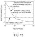 The pertinent thermophysical properties of, for example, sapphire is known, namely heat capacity and thermal conductivity, and therefore the sensitivity of an embodiment of the invention to thickness of a silicon layer on top of the sapphire may be modeled. This example and the examples below assume that a sapphire substrate is infinite, which is appropriate given the relative dimensions of the sapphire substrate compared to the thin films. In this example, an embodiment of the invention is extremely sensitive to the thickness of the silicon layer even for a one-nanometer silicon film. This is shown inFIG.12, which depicts the results of a simulation of an embodiment of the invention's sensitivity. This simulation and the simulations discussed in the examples below are based off of numerical solutions to the modulated heat equation, as detailed elsewhere for FDTR [31]. Since an embodiment of the invention will enable measurement the FDTR response of SOS system in the infrared, these sensitivity results are indicative of the sensitivity to film thickness. The interpretation of these sensitivity analyses in this example and the examples below is that the larger the value and larger the slope of these results means the embodiment of the invention is more sensitive to the parameter of interest, for example, film thickness. In these sensitivity analyses shown in the embodiment ofFIG.12, a film thickness of 1 nm for the film of interest is chosen so as to demonstrate that the invention is sensitive to film thickness, even in an ultra-thin regime. Therefore, the analysis clearly show that embodiments of the invention using an infrared FDTR technique may be extremely accurate in measuring the thickness of silicon films with film thickness down to 1 nm when on sapphire substrates.