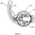 FIGS.2 and3 show bottom views of thewireless earphone10, whereinFIG.2 shows anantenna130 formed in the elastomer sleeve, andFIG.3 shows theantenna130 in the elastomer sleeve and aPCB230 in theearphone body200.