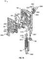 FIG.30 is cross-sectional perspective side view of cartridge andbackpack assembly3203 in whichprotrusion3016 and protrusion3304 ofcartridge frame160 can be seen cooperating to couplecartridge16 tobackpack3202 to form cartridge andbackpack assembly3203. To installbackpack3202 ontocartridge16, opening3201 ofbackpack3202 can be positioned overprotrusion3016 andbackpack3202 can be rotated (e.g., in a direction3401) to push latching features3302 ofbackpack3202 against latching protrusion3304 until latching protrusion3304 snaps into position between latching features3302. As shown,protrusion3016 may be formed on an additional latching structure ofcartridge16 such as aflexible arm3400.Flexible arm3400 may allowbackpack3202 to be pulled downward by a small distance whenbackpack3202 is rotated to press latchingfeature3302 onto protrusion3304.Flexible arm3400 may be resilient to maintain an upward force theholds latching features3302 in a latched position against protrusion3304.