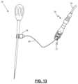 FIG.13 is a side view of the stimulation probe ofFIG.11 positioned over a stimulation target site and wherein the distal tip of the probe member and the stimulation target site are included in the camera's field of view;