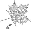FIG.40 illustrates an opticalcode signal tile550 created by the method ofFIG.39. As depicted inFIG.40, the lines of the Voronoi diagram are the darkest points of thetile550.FIGS.41-42 illustrate additional examples of optical code signal, masked to fit the shape of artwork elements, specifically, leaves552 and554. Here the line segments in the Voronoi diagram form a natural pattern of veins within theleavers552,554.