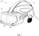 FIG.1 illustrates a non-limiting example of an electronic device in the form of an head-mounteddisplay device100, which may be coupled to a video rendering computing system via a wired or wireless connection to provide a virtual reality display to a human user. In operation, the user wears theHMD device100 on their head, secured via one ormore straps101, and receives displayed information at each eye viadisplays102aand102bsupported by asupport structure104 of the HMD device from the computing system of a simulated environment different from the actual physical environment, with the computing system acting as an image rendering system that supplies images of the simulated environment to the HMD device for display to the user, such as images generated by a game program (not shown) and/or other software program (not shown) executing on the computing system. The user is further able to move around the actual physical environment in this example, and may further have one or more I/O (“input/output”) devices to allow the user to further interact with the simulated environment, such as hand-held controllers that are communicatively coupled to the computing system via wired or wireless connections. As the user moves location and/or changes orientation of theHMD device100, the position of the HMD device may be tracked, such as to allow a corresponding portion of the simulated environment to be displayed to the user on the HMD device, and the controllers may further employ similar techniques to use in tracking the positions of the controllers (and to optionally use that information to assist in determining and/or verifying the position of the HMD device). After the tracked position of theHMD device100 is known, corresponding information is transmitted to the computing system, which uses the tracked position information to generate one or more next images of the simulated environment to display to the user via thedisplays102aand102b.