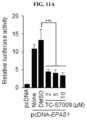 FIG.11A to11D shows the results that the HIF-2α inhibitor TC-S7009 effectively blocks transcriptional activity and tumor-initiating potential of HIF-2α without affecting cell viability and migration ability. (A) SW1353 cells were co-transfected with pcDNA3 or pcDNA3-EPAS1 and the HRE containing reporter plasmid in the absence or presence of different doses of TC-S7009. HRE reporter activity was normalized toRenillaluciferase activity (n=5). (B) Trypan blue exclusion assay to test the effect of TC-S7009 on cell viability of SW1353 cells (n=3). (C) Colony formation assay of SW1353 cells in the absence or presence of different doses of TC-S7009. The number of colonies counted using the ImageJ software (n=5). (D) Migration assay performed using SW1353 cells treated with DMSO or 10 μM TC-S7009. Representative images are shown (Left), and the relative area of migration (Right) was determined using the Image-Pro Premier software (n=6). (Scale bar, 200 μm.) Values indicate the mean±SEM, ***P<0.001, N.S., not significant, ANOVA (A-C) and Student's t test (D). P values; N.S.=non-significant, ***P<0.001. HRE=hypoxia response element; P=P value.