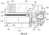 With respect toFIGS.21B and21C internal components of the pump-cap assembly are shown with certain electrical components removed.FIG.21B depicts the components within the gearbox.Motor328,mechanical coupling322, and screw334 are coupled to the gearbox. One or more dry zone seals379 may be disposed between the gearbox andmechanical coupling322 and/orscrew334. Upon rotation ofmotor328, the gears within the gearbox rotate, causingmechanical coupling322 to rotate.Mechanical coupling322 is coupled to a cam shaft ofmicrodosing system410 such that rotation ofmechanical coupling322 causes the cam shaft to rotate, which in turn causes the lever system to deliver a predetermined dose of medication to the wearer. At the same time, the gears within the gearbox also causescrew334 to rotate. Rotation ofscrew334 causesnut336 to move alongscrew334, preferably in the direction towardsplunger502 ofcartridge500.