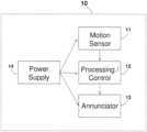 Adevice10 according to one aspect of the invention is described inFIG.2. Thedevice10 includes amotion sensor11, feeding the sensed motion information to a processing/control block12, which operatesannunciator13 in response to the motion sensed by themotion sensor11. The device is power fed from apower supply14. Themotion sensor11 detects and measures the change in position of thedevice10 with respect to time. Themotion sensor10 may include one or more accelerometers, which measures the absolute acceleration or the acceleration relative to freefall. For example, one single-axis accelerometer per axis may be used, requiring three such accelerometers for three-axis sensing. Themotion sensor11 may be a single or multi-axis sensor, detecting the magnitude and direction of the acceleration as a vector quantity, and thus can be used to sense orientation, acceleration, vibration, shock and falling. Themotion sensor11 output may be analog or digital signals, representing the measured values.