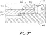 FIG.75E depicts diagrammatically two microwells75E1 and75E2 being formed with such an extended floating gate structure. As will become clear in a moment, the structures ofFIG.75E are in a partial state of completion. With reference toFIG.75E, one possible sequence for fabricating the microwell structure with an extended gate electrode could be as follow: After forming the layer75E3 of material (e.g., TEOS) which will provide the microwell walls, on top of a CMOS wafer wherein the ISFET structures have been formed, the areas that will become the wells are etched down to the metal layer, labeled M4, constituting the floating gate of the ISFETs. (Or, alternatively, if as stated above the microwells are formed directly in the CMOS passivation layer, layer75E3 can be omitted and this and other passages referring to such a layer can be understood to refer instead to the passivation layer and formation of the microwells in the passivation layer, instead.) Next, using a process such as sputtering or ALD, a thin layer of metal (e.g., about 0.25-0.50 μm of aluminum, titanium, tantalum or other suitable material) is deposited to form a layer74E4 in contact with the M4 layer, running over the bottom of the well and up the sidewalls. The thin metal layer will also cover the tops of the (e.g., TEOS) material between the microwells, forming an electrical short circuit between the wells, which will have to be removed. Next, one may optionally fill the wells with a suitable material such as various organic fill materials that are readily available, to prevent the next step from leaving unwanted debris in the microwells. The next step is to employ CMP or another suitable technique to planarize the top of the structure down to a level that exposes the tops of the microwells and the material layer75E4 on the top of the sidewalls. Having thus exposed the metal layer75E4, that metal is removed from the tops of the microwell array (especially the tops of the sidewalls and TEOS between the sidewalls) in any satisfactory way). For example, the metal75E4′ at the top of the microwell structure (i.e., on the exterior top of the sidewalls) may be etched away or removed using metal CMP to further planarize the tops of the wells. Having removed the short circuit between the wells, the filler material, if used, is then removed. The extended gate metallization is then covered by application of the thin dielectric layer discussed above,75E5, such as a tantalum pentoxide (Ta2O5) ALD passivation, using ALD, for example. The dielectric/passivation must cover all edges of layer75E5 to avoid electrically short-circuiting wells via the analyte fluid.