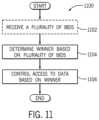 Atblock1104, themethod1100 includes determining a winner based on the plurality of bids. In one embodiment, the roadcondition monitoring system102 determines a winning bid from the plurality of bids wherein the winning bid is the highest bid from the plurality of bids. In another embodiment, the roadcondition monitoring system102 selects a third party from a plurality of third parties having the highest bid. At block1106, themethod1100 includes controlling access to the data based on the winner. In one embodiment, the roadcondition monitoring system102 controls access to the roadway data by transmitting the roadway data to a third party server associated with the winning bid.