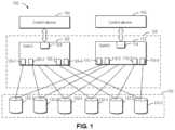 Switches112 and122 also includeuplink ports114 and124 for connection tocorresponding control devices102 and104. For ease of description, downlink ports116-1 and116-2 ofswitch112 are sometimes collectively or respectively referred to as downlink port116, and downlink ports126-1 and126-2 ofswitch122 are sometimes collectively or respectively referred to as downlink port126.