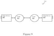 FIG.9 illustrates an example of making use of the different types of processing units within each element withinnetwork fabric900.Network fabric900 includes four elements: edge device905,node915,node920, andedge device910. The twoedge devices905 and910 are connected to each other vianetwork nodes915 and920. In addition, the twoedge devices905 and910 are also connected to external devices that would use thefabric900 to communicate (e.g., file transfer, web service, etc) with each other.