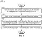 Themethod900 may further include, atblock915, communicatively coupling the IR detector, the first light source, and the second light source to a processor of a computing device. The computing device may be similar to the information handling system described in connection withFIG.5 in an embodiment. The communicative coupling atblock915 of the IR detector with the computing device may further include, in an embodiment, electrically coupling the components of the IR camera to the computing device as well to power the IR detector, a first light source, and a second light source.