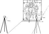 Referring toFIG.2,image collection devices106 may be arranged in a variety of positions to optimally capture an athlete's image. For example, a series of alternating cameras may be positioned along an elevated or overhead position at orproximate start112 to capture forward and/or overhead perspective views of an athlete approaching and crossing the start. Additional cameras may be positioned medially and/or laterally (left and/or right) of the start, and/or forward of the start. Proximate the starting line, one ormore cameras106bmay be positioned at a lower elevation so that the digital commencement image is captured at an angle below a horizontal plane intersecting a chin of the athlete, or where desired, below a horizontal plane intersecting a waist of an athlete. Other camera angles may be used as desired.