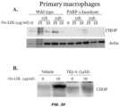 FIG.30 shows (A) primary macrophages were isolated from WT or PARP-1−/− mice. Cells were then incubated either for 12 or 24 h in the presence or absence of the indicated concentration of oxLDL. Protein extracts were prepared from then collected cells the subjected to immunoblot analysis with antibodies to CHOP or Actin. (B) RAW cells (mouse macrophage cell line) were treated with 10 mg/ml oxLDL for 6 h in the presence or absence of 1 mM of the PARP inhibitor TIQ-A. Protein extracts were prepared from the collected cells then subjected to immunoblot analysis with antibodies to CHOP.