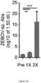FIGS.2A-2H show results from experiments in Example 1 in which complete protection against MARV and ZEBOV challenge was observed. Animal survival data is shown inFIG.2A andFIG.2E.FIG.2A shows trivalent vaccinated animals survived post MARV challenge while control animals all died byday 10.FIG.2E shows trivalent vaccinated animals survived post ZEBOV challenge while control animals all died by day 7. Data for % change in body weight for vaccinated and control animal are displayed inFIG.2B for vaccinated challenged with MARV. The y axis indicates change in body weight as shown inFIG.2F. The light solid line is for Trivalent vaccinated animals. The light dashed line is for TriAVE, the average results of the Trivalent vaccinated animals. The dark solid line is for control animals. The dark dashed line is for Control AVE, the average result for the control animals. The light solid lines and light dashed lines remain steady on the graph in the days post challenge showing no significant weight loss among vaccinated animals. The dark solid lines and dark dashed lines decline on the graph from days 0-9 post challenge ending with the dagger denote animals that succumbed to disease byday 10. Data for % change in body weight for vaccinated and control animal are displayed inFIG.2F for vaccinated challenged with ZEBOV. The y axis shows change in body weight as a percent. The light solid line is for Trivalent vaccinated animals. The light dashed line is for TriAVE, the average results of the Trivalent vaccinated animals. The dark solid line is for control animals. The dark dashed line is for Control AVE, the average result for the control animals. The light solid lines and light dashed lines remain steady on the graph in the days post challenge showing no significant weight loss among vaccinated animals. The dark solid lines and dark dashed lines decline on the graph from days 0-6 post challenge ending with the dagger denote animals that succumbed to disease beforeday 8. (n=3 for gpMARV and n=6 for gpZEBOV). Binding Abs (FIG.2C and FIG.2G) and NAbs (FIG.2D andFIG.2H) were measured in serum from vaccinated animals before (Pre) and after the first (1×) and second (2×) immunizations. Analysis was conducted on pooled serum (FIG.2H). *p<0.1; ***p<0.001; ****p<0.0001.