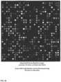 FIG.34 is a photograph of a magnified portion of a top view of a microarray having a combination reaction layer, wherein the combination comprises sucrose and fructose. The lighter spots are fluorescence of fluorescently labeled nucleotides that were hybridized with the array after in situ synthesis of DNA oligos. The oligomers have a length of 65 mers.