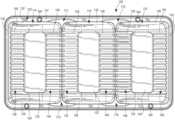 In the illustrated embodiment, thefirst divider152 is interconnected with theperipheral rim150 by two scallopedledges172,174, while thesecond divider154 is interconnected with theperipheral rim150 by two scallopedledges176,178. The scalloped ledges can resemble a truncated gingko leaf or a (non-mathematical) hyperbolic shape. Indeed, a portion of the scalloped ledges protrudes beyond the adjacent side walls, as shown inFIG.7, and into the flange portion, as shown inFIG.4. The scalloped ledges function to allow for flexing of the compartments away from each other when end walls of the tray are subjected to compressing forces by pivoting about apexes of the dividers, such that opposing divider walls can move away from each other, e.g., the angle between opposing divider walls (e.g.,140,142) increases.