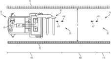 Those practicing the concepts of the present disclosure and familiar with industrial vehicle design and control will appreciate that the lift height of the storage andretrieval hardware20 or the traveling speed of thevehicle drive mechanism25 may be controlled in a variety of conventional or yet-to-be developed ways, the particulars of which are beyond the scope of the present disclosure—examples of which include U.S. Pat. No. 6,135,694, RE37215, U.S. Pat. Nos. 7,017,689, 7,681,963, 8,131,422, 8,718,860, each of which is assigned to Crown Equipment Corporation.